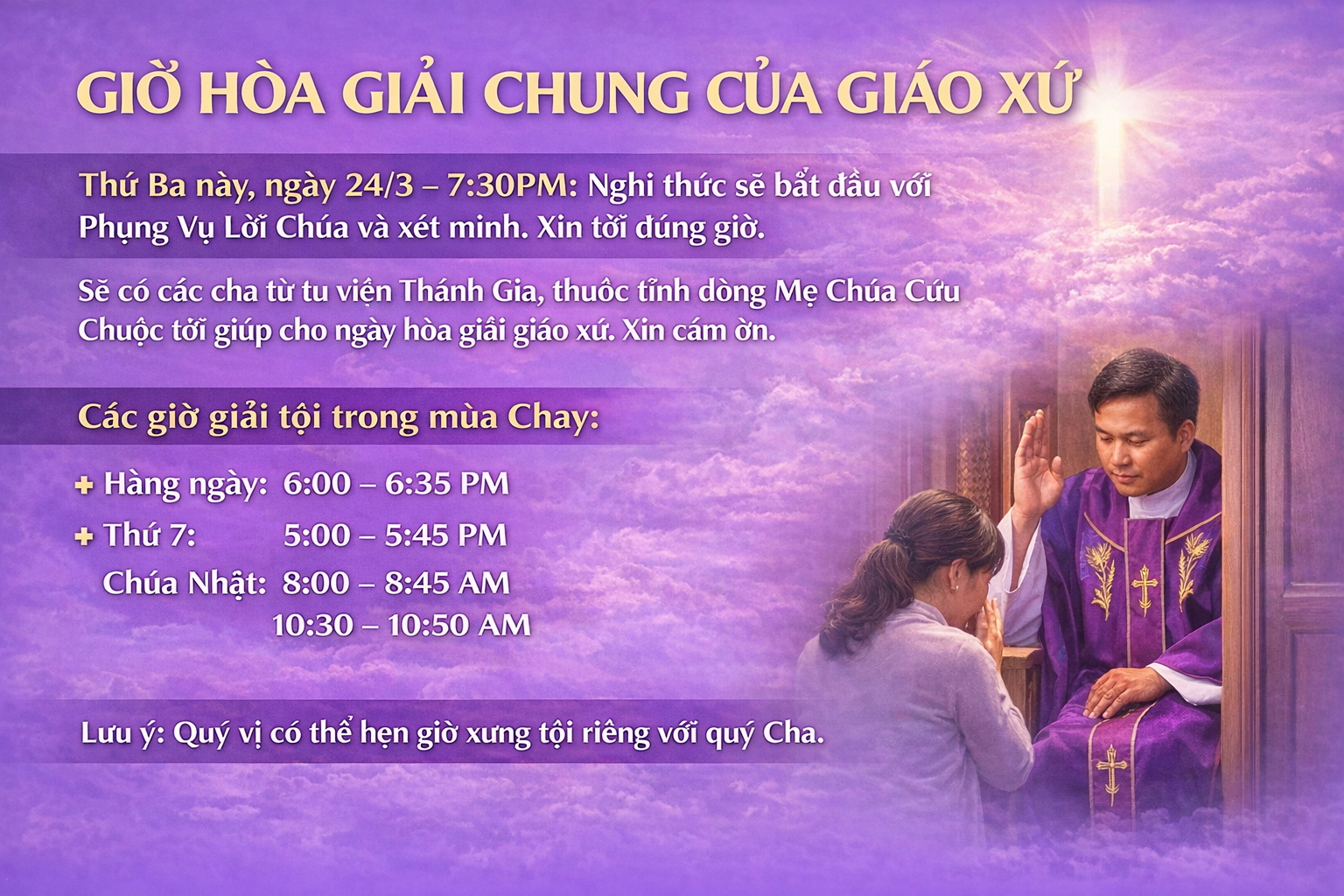 Monday-Friday 6:00 pm - 6:25 pm Thứ Bảy - Saturday 5:15 pm - 5:45 pm Chúa Nhật - Sunday 8:15 am - 8:45 am 10:15 am - 10:45 am